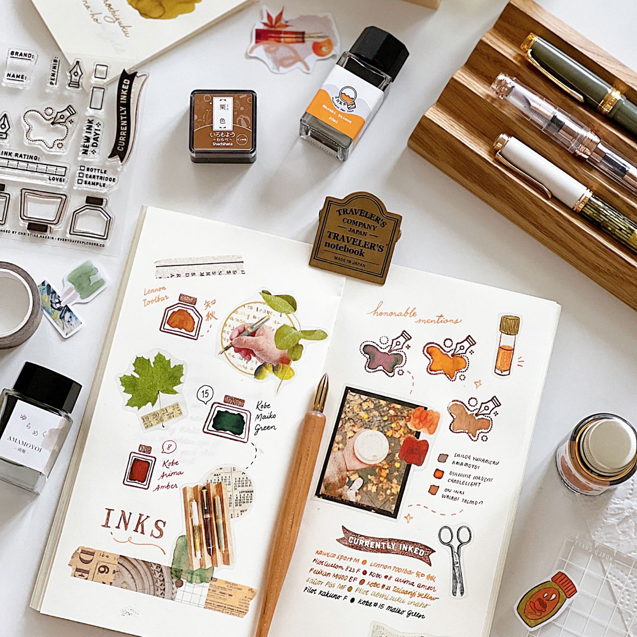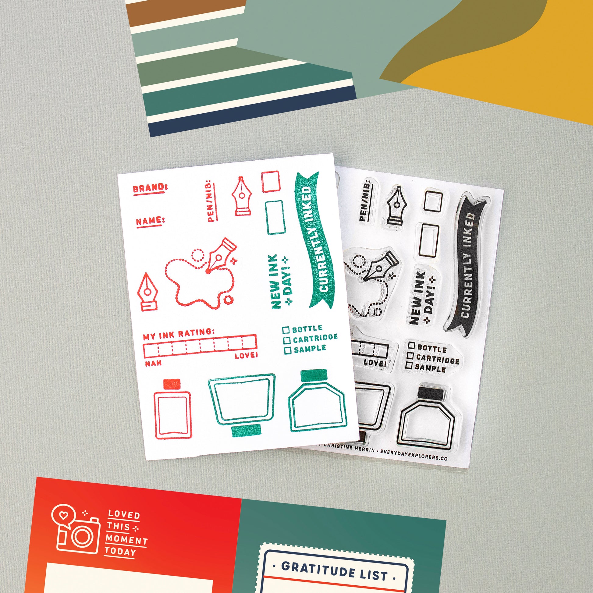 If you're an fountain pen lover who loved swatching new ink, this set is for you! Document the inks you're currently using, or your entire ink library with this 3x4 set! The wider ink bottles are a little less than 1" wide, so this mini stamp is for smaller notebooks and journals.